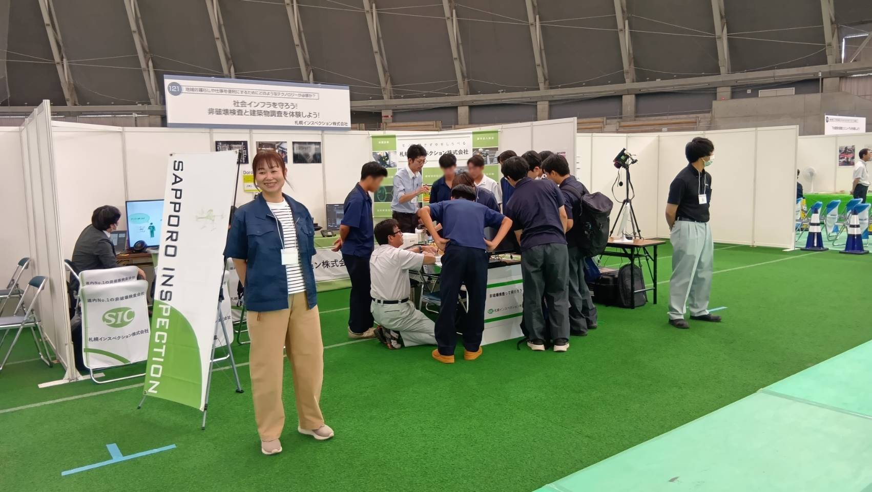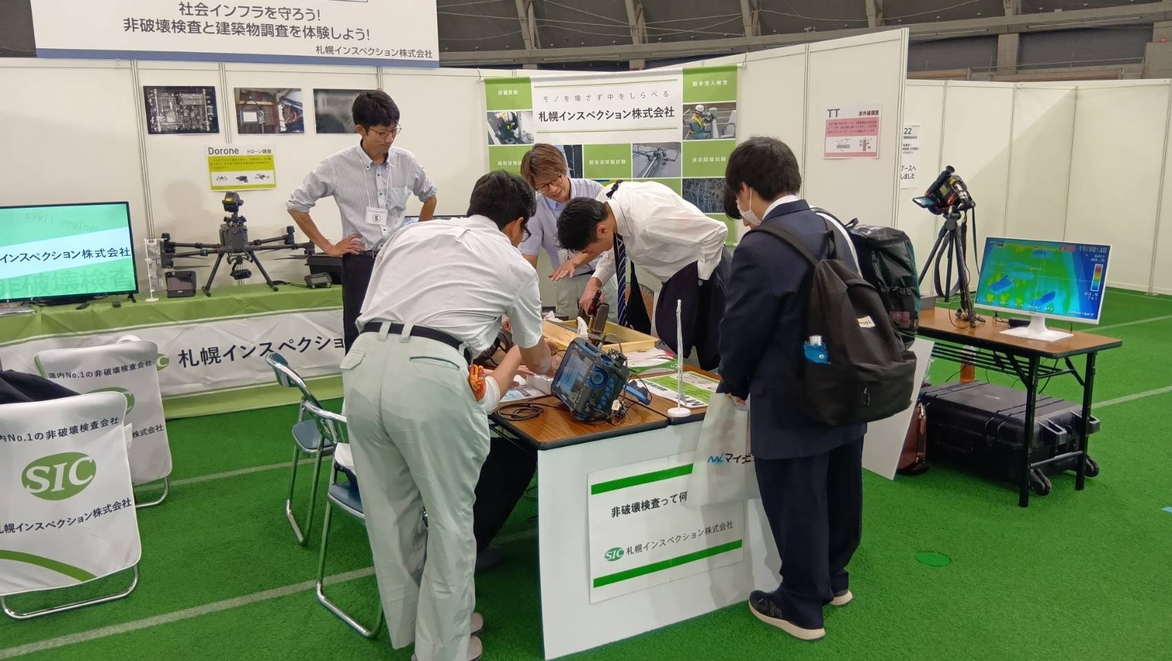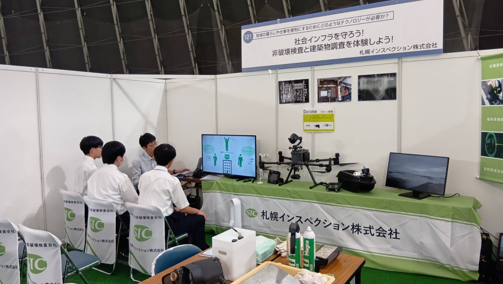 当社の体験ブースでは「社会インフラを守ろう!非破壊検査とインフラ点検体験」と題して、実際に現場で使われている 超音波探傷・フェイズドアレイ探傷・磁粉探傷 の非破壊検査機器に触れていただきました。また、ドローンや赤外線カメラの模擬展示 も行い、多くの高校生に参加いただきました。